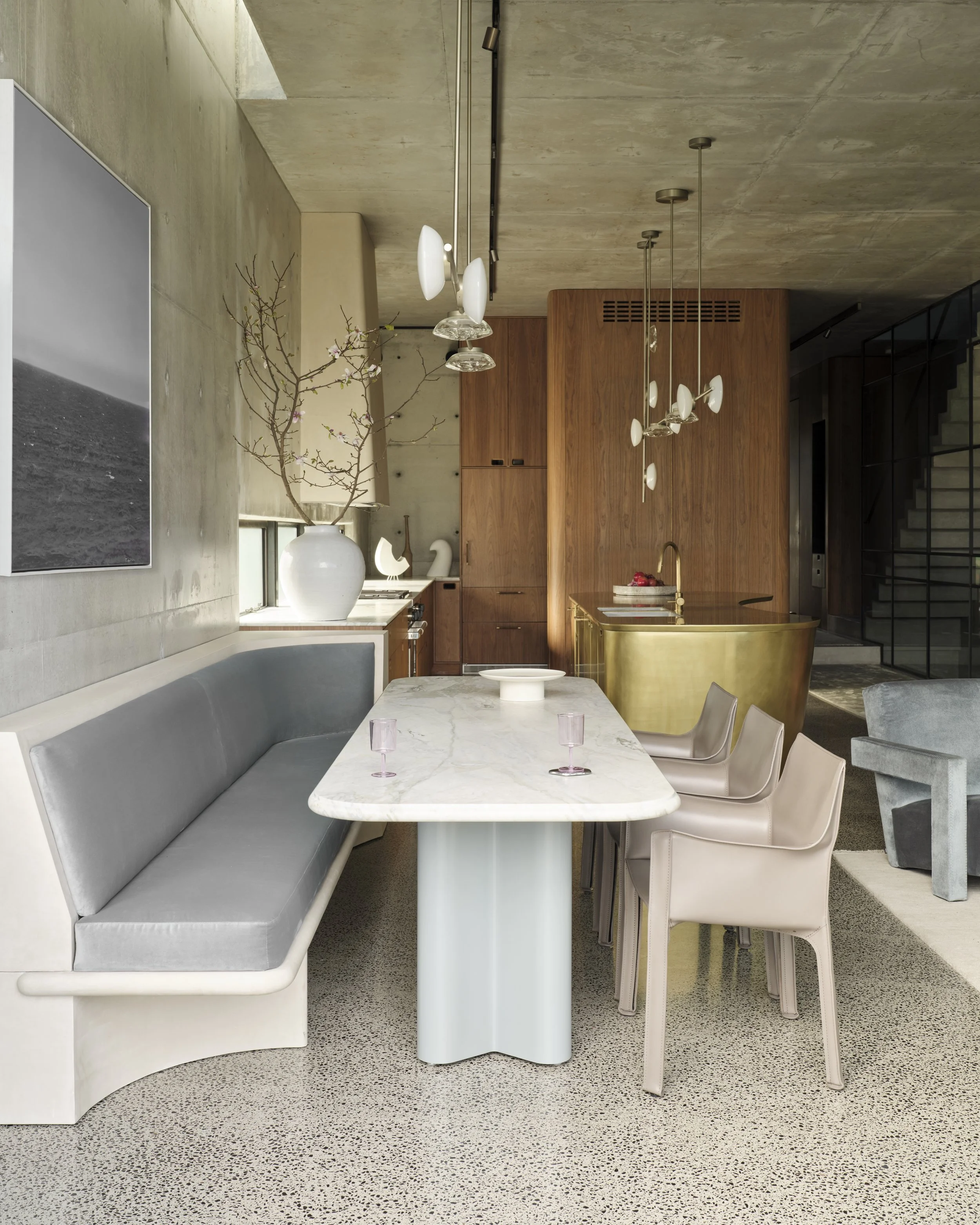 We were approached to re-envision a beloved home that we had designed two years previously, this time for new owners, a professional couple with teenage children. An intriguing opportunity - to re-think familiar spaces in a new light, considering the different tastes and preferences of new occupants. A re-invention without the ‘heavy lifting’ required by full-scale renovations: a ‘light take’. Our clients design brief was to inject warmth, intimacy and comfort within a soaring concrete bunker to be a home that facilitated elevated family living whilst responding to the way in which they wanted to inhabit the space. The family wanted a space that not only welcomed larger hospitable group experiences, but that also allowed for quieter moments for retreat. Though highly curated, it is a space that was designed for living well.