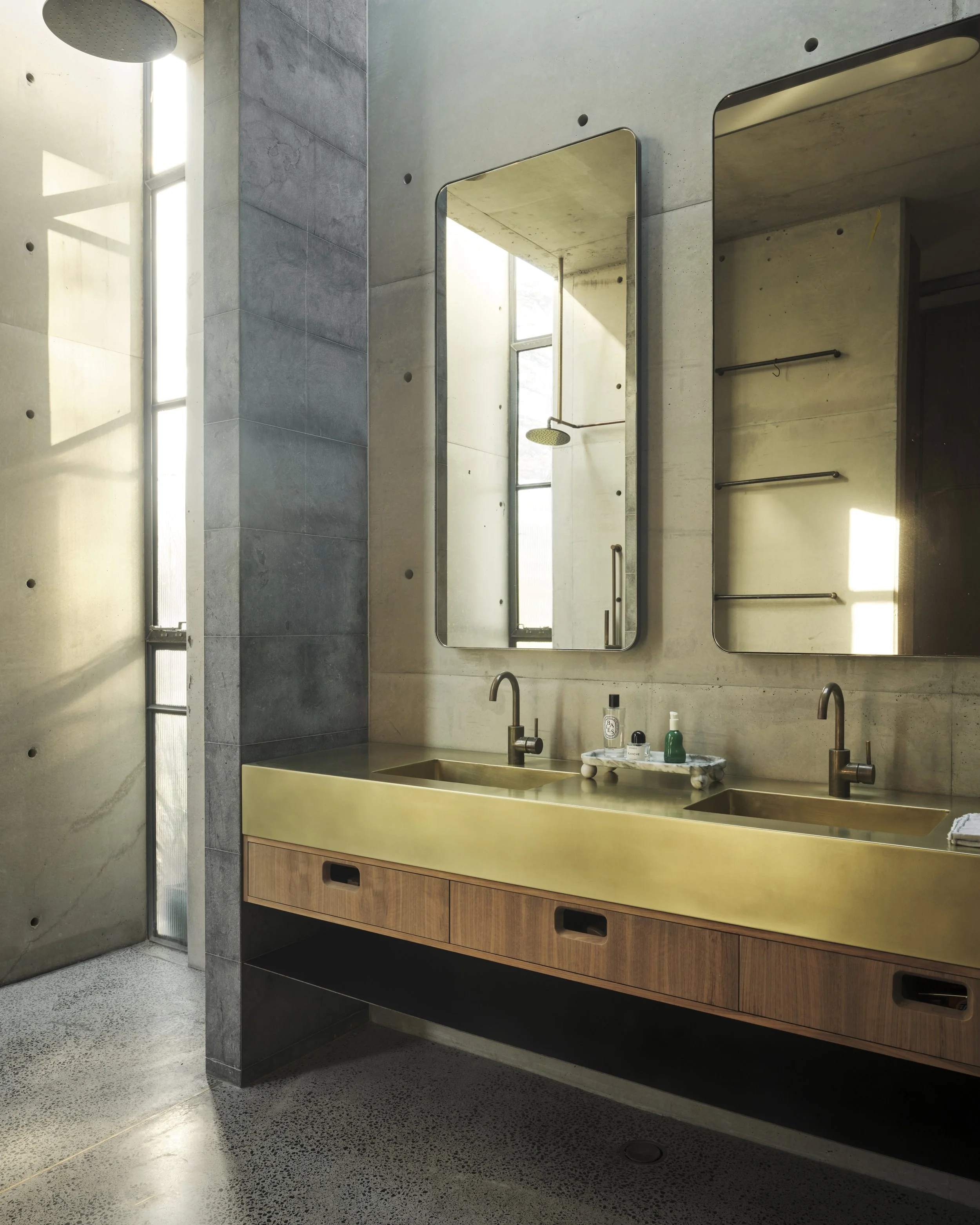 Colour used as a ‘feminine’ counterpoint to the ‘masculine’ elements of the raw off-form concrete walls and soffit, always a balance of shape, form and tone. The resulting space is a reflection of the manner and sophistication of the owners themselves. There is a delicate softness interspersed throughout the home with ‘punchy’ elements that comfortably sit against its cool industrial backdrop of the home.