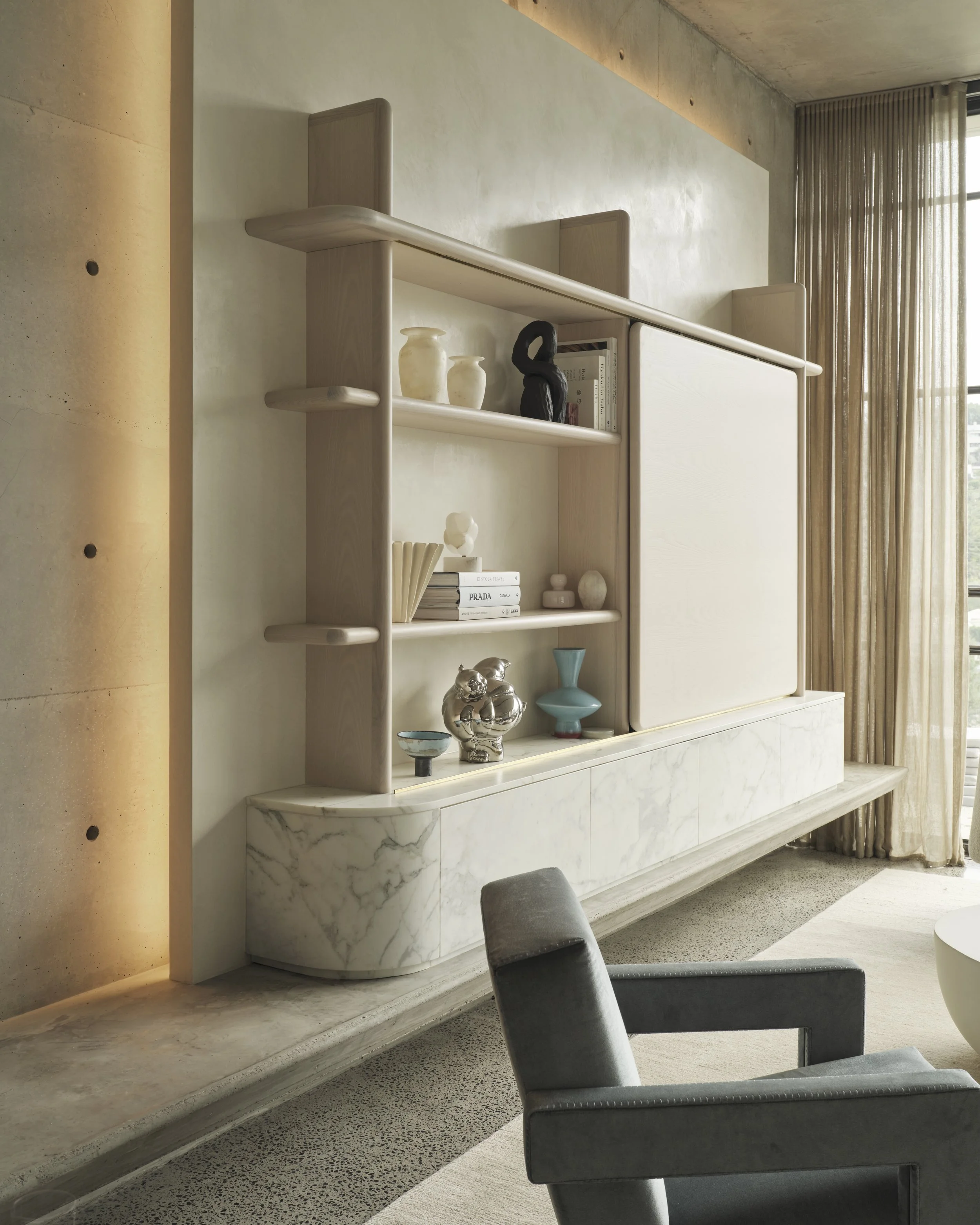 Our directive was to provide conversational and comfortable settings as well as new and adapted joinery and decorative elements within the existing space that would add a sense of warmth and softness that paired with the urban contemporaneity of the homes existing architecture.